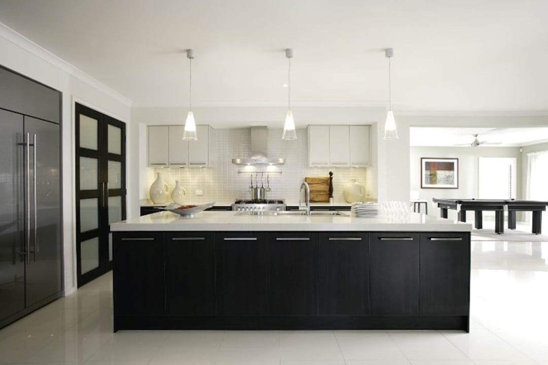 “One of the important things to remember with pendants is to keep the lighting proportional to the island bench. If you have a grand island bench, you can play with scale and proportion in the feature lights such as having three pendants or one large feature light.